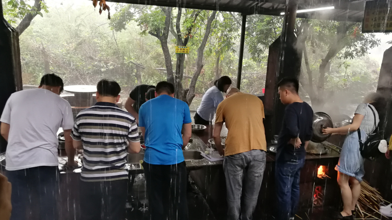 ??????? 雨水在廚房的屋頂上快速滑落,形成“叮叮咚咚”的雨簾。就這樣在暴雨中野炊也別有一番風(fēng)味,正所謂眾人拾柴火焰高,六七個(gè)大老爺們“鏗鏗鏘鏘”地切菜配菜,五六個(gè)姑娘洗菜燒火,大家各顯身手,很快3桌美味的飯菜烹制而成。下午在參觀靈芝和梅花鹿基地后,我們踏上了返程之旅。