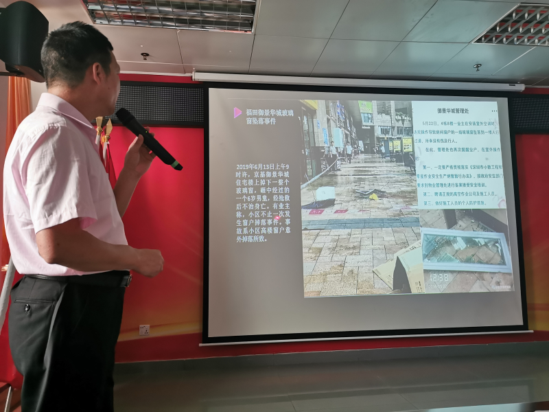 ?????? 主講人培訓(xùn)部傅經(jīng)理以“人的安全需求”為引子,帶領(lǐng)大家一起回顧“福田御景華城玻璃窗墜落·5歲男童被砸身亡”事件始末,深入剖析該事件背后小區(qū)物業(yè)管理的紕漏,強(qiáng)調(diào)高空墜物防范工作的重要性,要求各小區(qū)管理處做好自糾自查工作,范圍包括樓宇墻面瓷磚、公共區(qū)域窗戶、玻璃、廣告牌、外掛空調(diào)機(jī)架、百葉窗、安全出口燈、應(yīng)急照明燈、標(biāo)識(shí)標(biāo)牌及其他。并要求各管理處做好宣傳工作,號(hào)召居民定期檢查家中門窗,在更換窗戶時(shí),務(wù)必多系一道安全繩,避免不慎墜落傷人。會(huì)后,品質(zhì)部楊經(jīng)理下發(fā)《樓宇公共設(shè)施日常自查記錄表》《樓宇墻面瓷磚日常自查記錄表》,敦促各管理處務(wù)必按標(biāo)準(zhǔn)嚴(yán)格做好隱患排查工作。