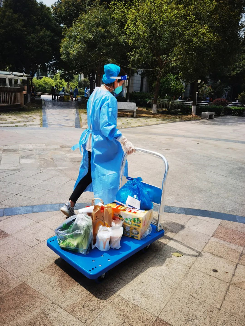 ? ? ? 時間緊任務(wù)重,精致的客服女孩們素面朝天,在完成本職工作后,也擼起袖子加入了送快遞的隊伍。到了飯點,大家席地而坐匆匆吃完飯,又繼續(xù)忙碌。盛芳園是沙井街道最大的統(tǒng)建樓,占地面積89600㎡,共有1680戶,全小區(qū)的快遞和生活物資全部依靠政府和物業(yè)人員進行配送,工作強度不言而喻。