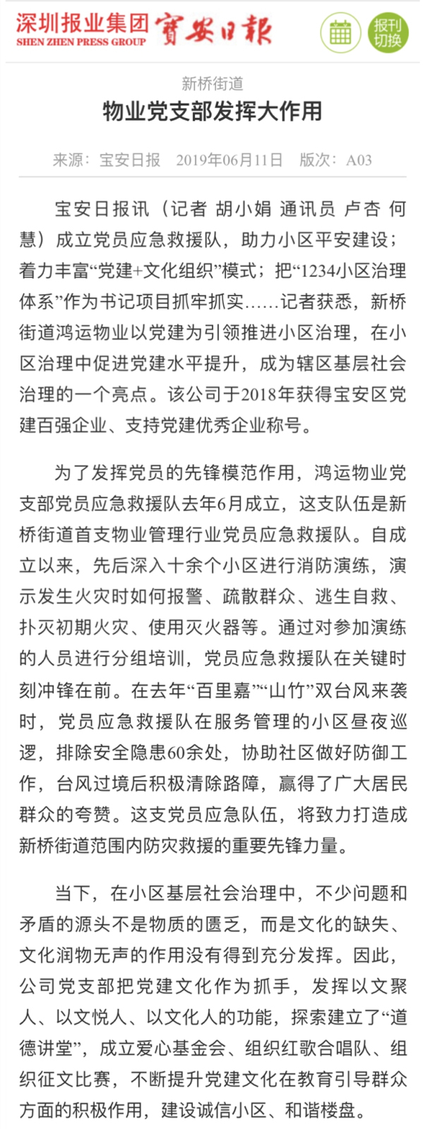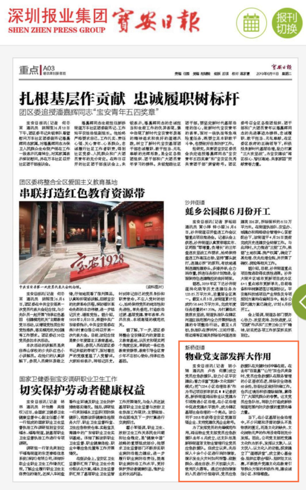 ?????? 6月11日,寶安日報以“新橋街道物業(yè)黨支部發(fā)揮大作用”為題,對我司黨支部工作進行報道。以下為報道全文:
